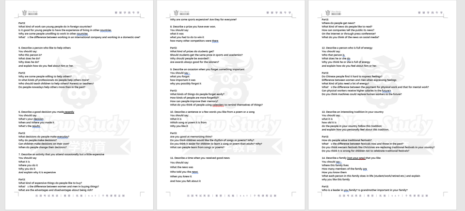 当你还在为9-12月口语新题感到苦恼时,贴心的牛学早已准备好了一份大惊喜!备考9-12月雅思考试的烤鸭们注意了,期待已久的终极完整版口语新题来喽!上周发出的口语新题包罗了Part1 15道新题和Part2&Part3 的20道新题,希望大家都有好好准备,毕竟换题季,带给我们的挑战也更大了。这次的完整版,经历了牛学教育精英团队加班加点的整理研究,终于在今天推出!