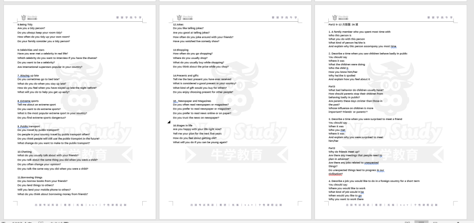 新题卡共19页 4971字,由雅思口语8.0分老师亲自编写整理,目前新提卡已经基本稳定,大家可以持续关注牛学,后续如有新题,我们会在第一时间更新。掌握一手资源,雅思口语高分不是梦。